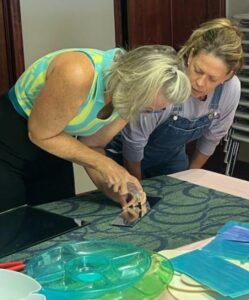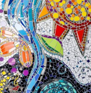 Vicki leads students toward envisioning and designing of the final product as well as their own personal projects. From there, she facilitates the creation of vibrant mosaic artworks and permanent wall installations using low-fire tile, high-fire tile, sparkling mirror, colorful stained glass, translucent glass, and an array of eye-catching materials. She teaches students the safe and efficient methods of breaking ceramic tiles, cutting tesserae with hand precision tools, and adhering materials onto the proper substrates.